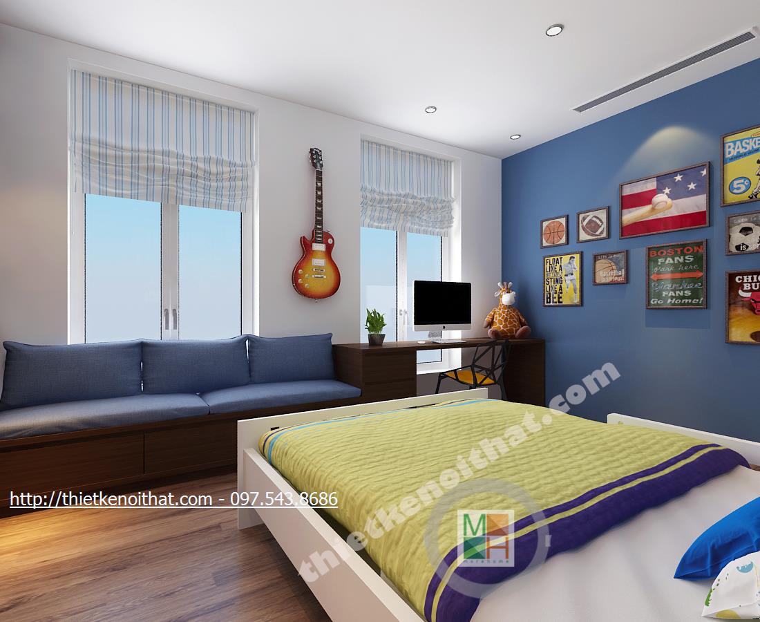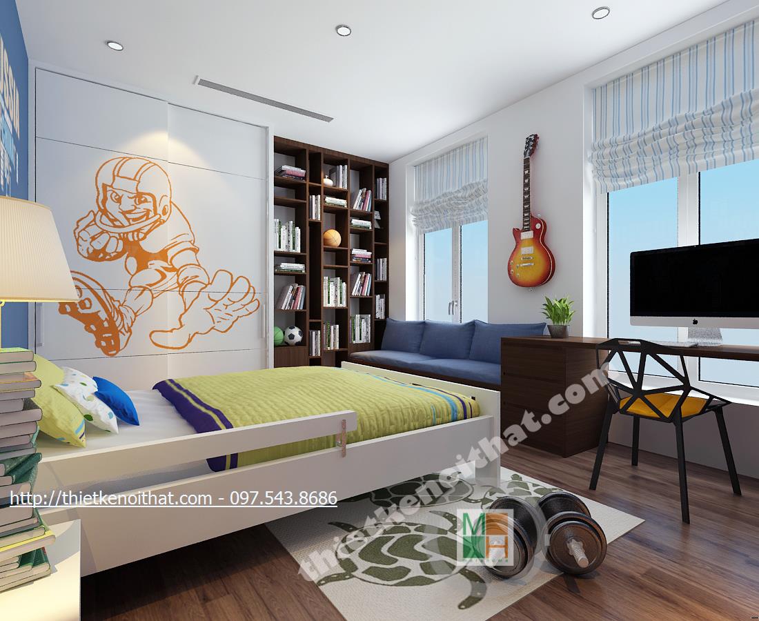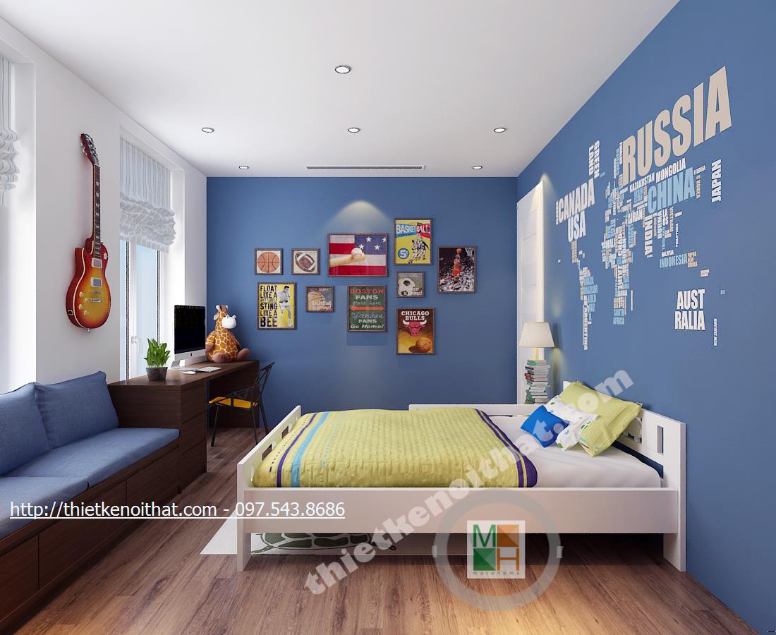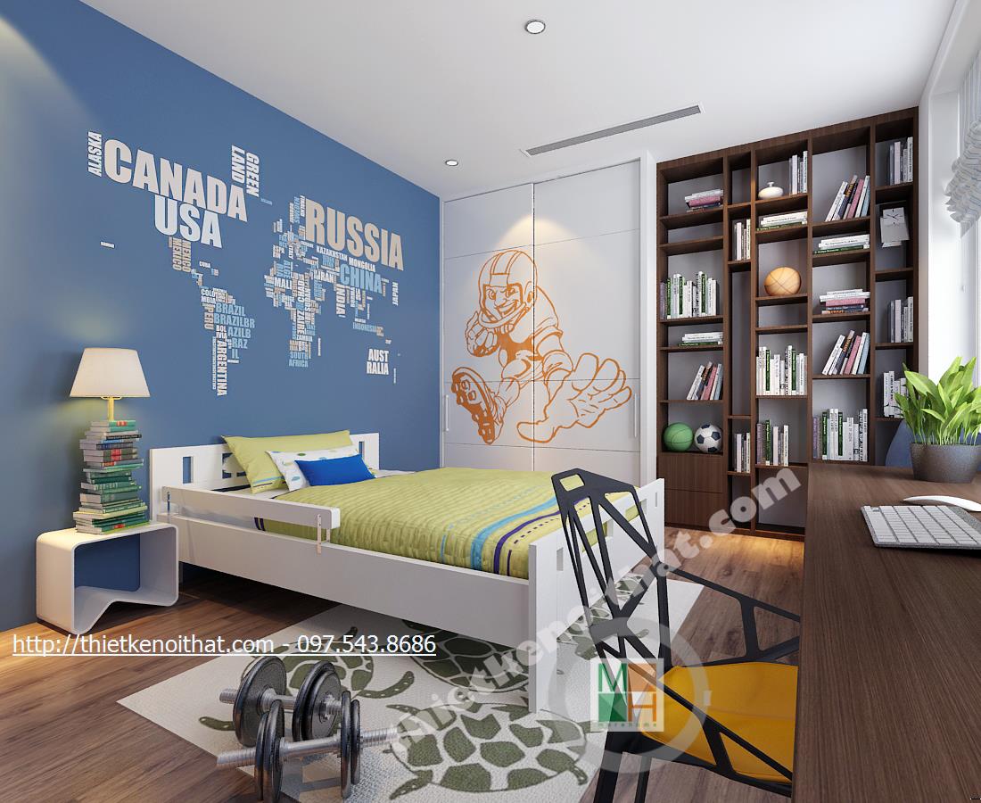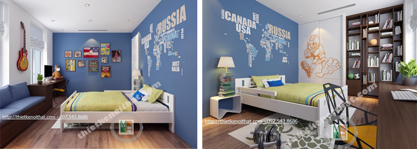 Phòng ngủ con trai năng động cùng sắc xanh và tranh dán tường bản đồ độc đáo