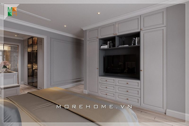 Mẫu thiết kế phòng ngủ chung cư, nhà phố, biệt thự kết hợp giữa hai phong cách tân cổ điển và hiện đại, tông màu trắng chủ đạo khiến căn phòng trở nên sáng và sang trọng.