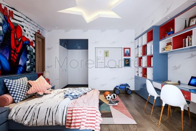 Để tạo ra một không gian thân thiện cho bé trai, thiết kế nội thất phòng ngủ của họ với tông màu chủ đạo là đỏ và xanh khơi dậy nguồn sáng.