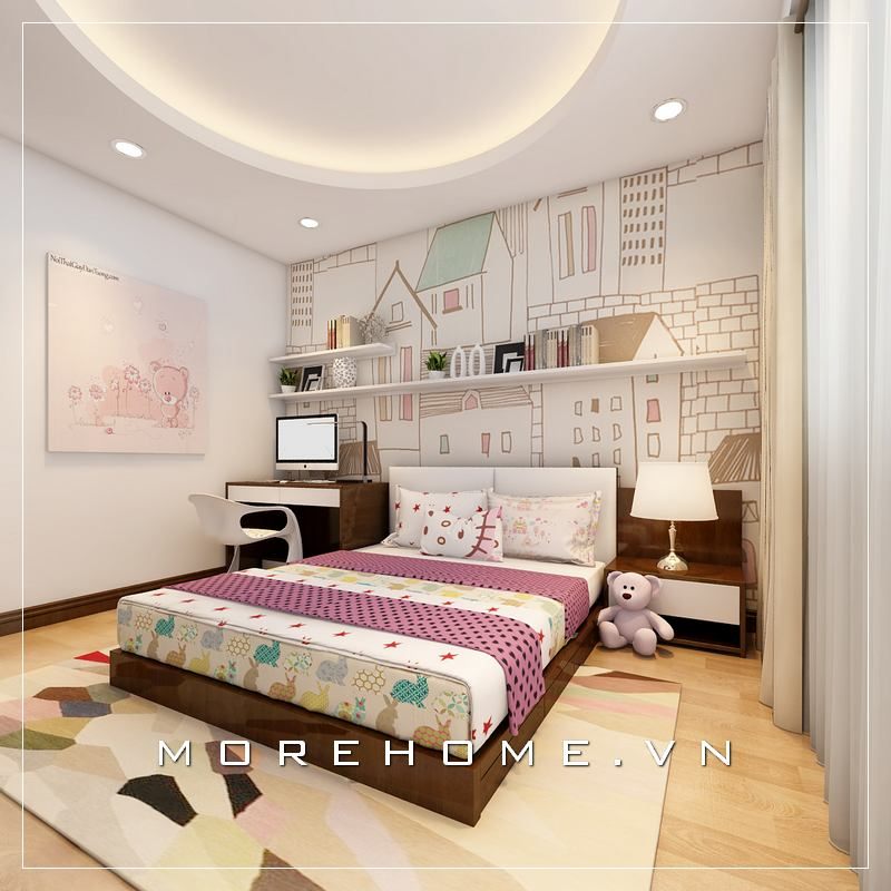 Giường ngủ gỗ công nghiệp màu nâu, kết hợp với tab đầu giường, bàn học tạo nên một bức tranh đồng điệu và ấn tượng cho phòng ngủ của con gái bạn.