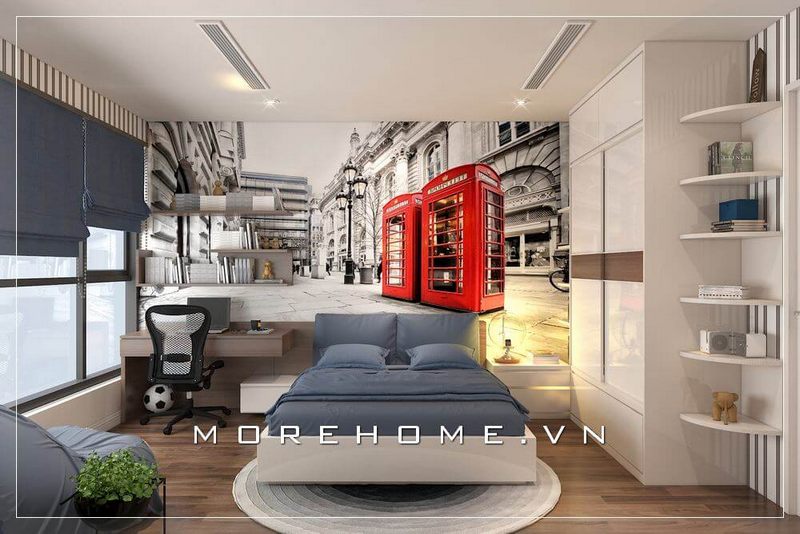 Mẫu thiết kế phòng ngủ trẻ em đẹp được tạo nên bởi một giường tầng màu xanh độc đáo, gây ấn tượng và làm nổi bật cho căn phòng.
