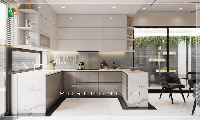 Morehome mang đến cho không gian sống của gia đình những mẫu tủ bếp đẹp và ấn tượng với phong cách thiết kế hiện đại, màu trắng.
