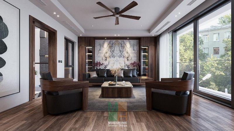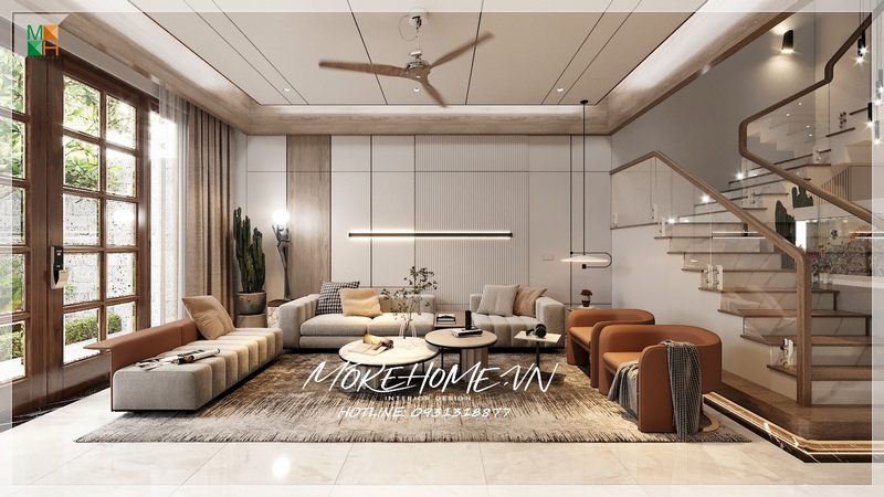 Mẫu thiết kế nhà biệt thự, phòng khách với nội thất gỗ óc chó cao cấp giúp tạo nên không gian rộng lớn, sang trọng và thoáng đãng.